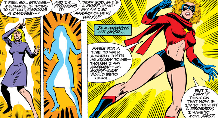 O alienígena Yon-Rogg sequestrou Carol, e eventualmente acabou lutando com o Mar-vell. Durante essa luta, Carol foi atingida por a explosão de uma máquina Kree, se tornando uma híbrida, meio-humana, e meio-kree.
