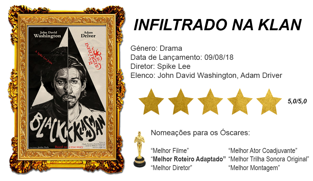 “Infiltrado na Klan” é um filme de reflexão, com uma banda sonora incrível, atores que não desapontam e uma forma leve de abordar os conceitos de racismo mas que, ao mesmo tempo, consegue atingir as pessoas no coração de uma maneira impressionante. É realmente um filme digno de Óscar: não é à toa que o filme ativista foi nomeado para seis e levou um prémio para casa na noite passada.