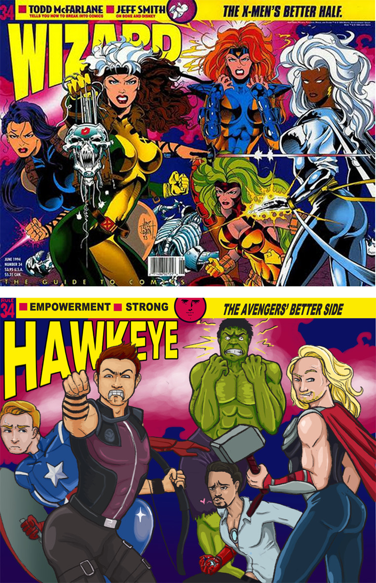 Uma forma bem simples de refletir sobre a diferença de tratamento que se dá às figuras femininas e as masculinas é invertendo a posição destes. Como crítica à representações sexistas, em 2012 surgiu a The Hawkeye Initiative*, uma página de ilustrações satíricas: