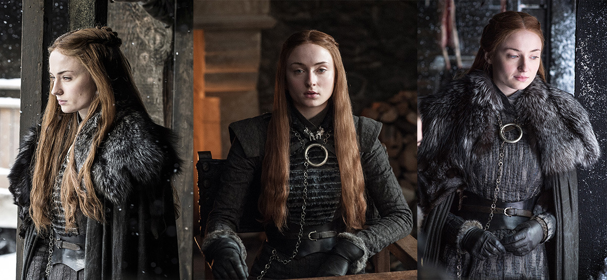 E por último, na oitava temporada, temos Sansa usando uma armadura. Ela, como todos em Winterfell estão cientes de que uma guerra está por vir. O colar e os lobos ainda estão presentes. Ela é uma Stark e está em Winterfell. Sansa sabe quem ela é e sua identidade está mais forte do que nunca.