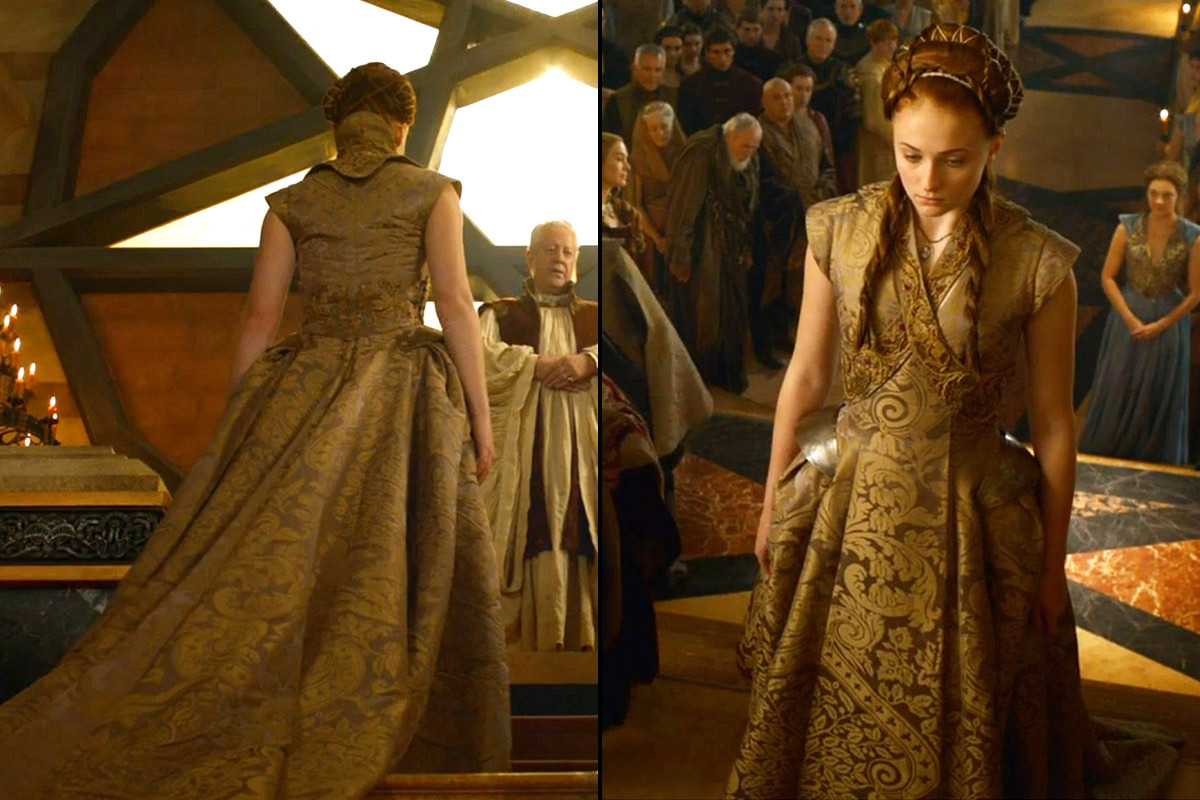 Um ótimo exemplo de detalhes em figurinos que contam a história de um personagem é o vestido de seu casamento com Tyrion. Sansa não participou do desenvolvimento dele e seu design veio de Cersei, ou seja, não é romântico ou feminino com flores mas sim uma mensagem de dominância, mostrando que ela pertence a eles. Seu manto é bege e carmesim com leões no bordado. Em seu adereço em volta da cintura e pescoço é possível ver lobos e peixes juntos, suas casas de família, leões em cima de lobos, mostrando a sedução Lannister que sofreu, um leão com uma coroa Baratheon, Joffrey, e atrás de seu pescoço um grande leão, mostrando que Sansa agora pertence totalmente aos Lannisters.