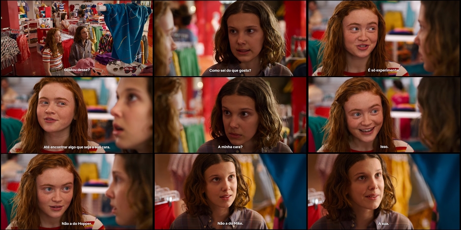Percebemos que algumas restrições foram impostas com relação ao contato de El com outras pessoas, e vemos também essas regras sendo quebradas quando ela e Max decidem se divertir em um dia sem garotos. Essa cena, assim como outras que serão faladas mais pra frente nessa matéria, foram importantíssimas para a representação de um empoderamento feminino, destacando a personagem “Eleven” não só como namorada do Mike, dotada de superpoderes, e filha do xerife Hopper, mas também como alguém que toma suas próprias decisões e está descobrindo seu próprio estilo, como uma adolescente normal. E o resultado, é essa cena maravilhosa :