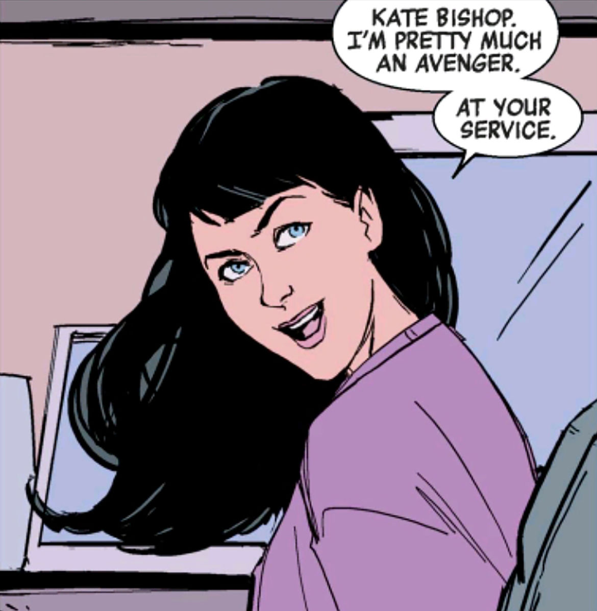 Kate Bishop é extremamente fã dos Vingadores, mas principalmente de Clint Barton (que futuramente co-utilizaria seu codinome, Hawkeye), que a salvou quando era pequena.
