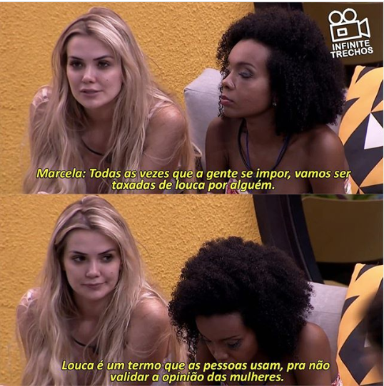 A questão é a seguinte: no BBB19, as participantes Gabriela Hebling e Rizia Cerqueira, mulheres negras, se pronunciavam exatamente sobre as mesmas questões e eram chamadas de chatas, “mimizentas” e raivosas. Hana Khalil, da mesma edição, também recebeu muito mais destaque que as companheiras, e todas compartilhavam da mesma linha de pensamento. Quando as mulheres negras compartilham suas dores e indignações são silenciadas e oprimidas, enquanto a mulher branca é exaltada. Representação feminina sempre é bom, as declarações de Marcela não deixam de ser pertinentes, mas vamos começar a valorizar todas as mulheres, sem seletividade?