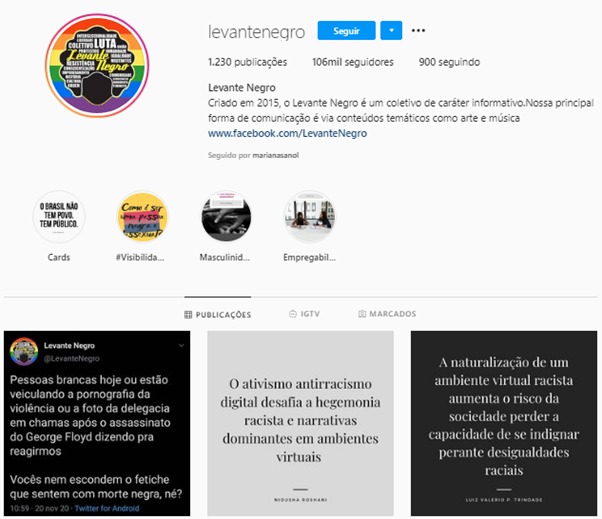 Levante Negro é um coletivo de caráter informativo que busca compartilhar conteúdos como arte e música e divulgar trabalho de profissionais negros. Temas como violência contra a população negra, saúde pública e ações culturais