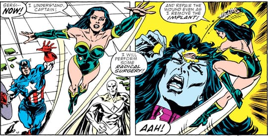 Isso levou diretamente a uma grande batalha com os heróis antes que eles descobrissem como devolver o laboratório à realidade. Nebula usou a confusão da reentrada para se teletransportar de volta para sua nave. Eventualmente, Starfox a nocauteou com um de seus poderes de amor pouco antes dos Vingadores aparecerem. Quando o Homem-Aranha encontrou a unidade de compressor atômico, ele detonou uma explosão que transferiu os poderes da Infinity Union para Nebula, dando a ela poderes divinos.