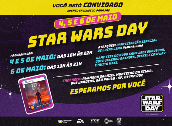 Os fãs também poderão participar da celebração em um evento temático em ação conjunta com o Mercado Livre e Eletronic Arts na loja da Iron Studios – no bairro Jardins, em São Paulo (SP) – nos dias 04 e 05 de maio, das 18:00 às 22:00, e no dia 06 de maio, das 13:00 às 21:00. A ação será aberta ao público e contará com uma programação especial com aulas de sabre de luz, quizzes, desfile e meet & greet com cosplayers, painéis sobre próximas novidades da franquia, showroom de produtos licenciados e game test do esperado jogo Star Wars: Jedi Survivor.