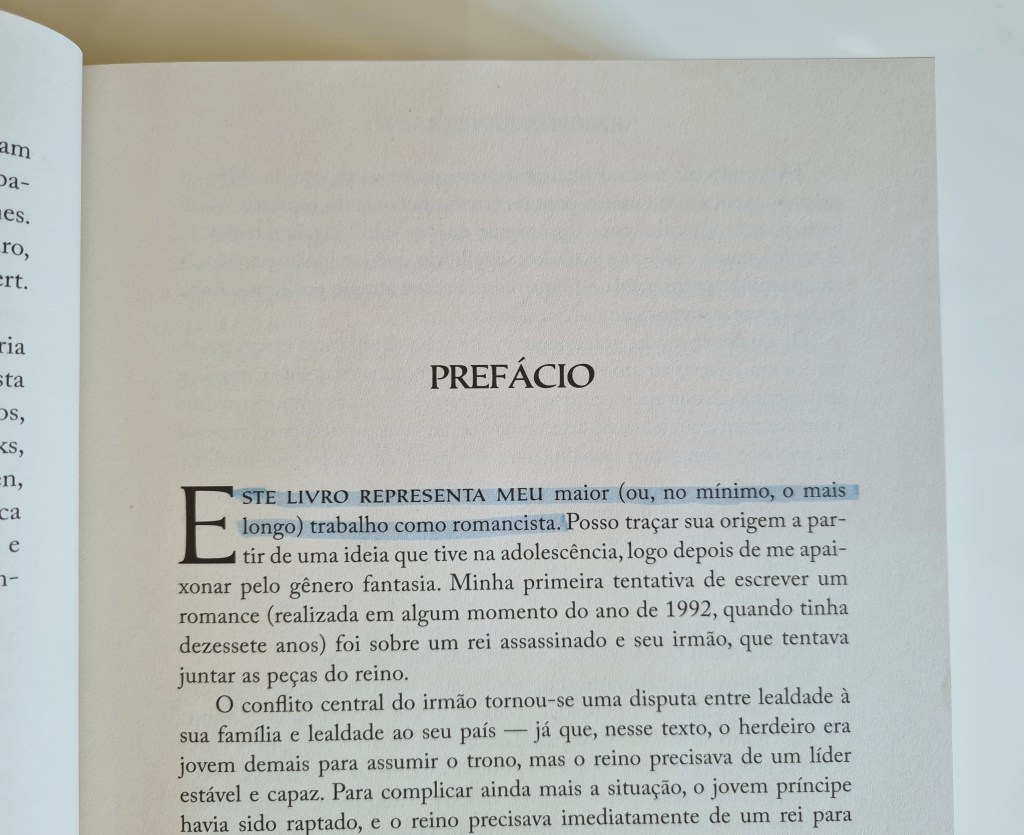 Brandon Sanderson introduz ‘O Caminho dos Reis’ nos contando que levou mais de 20 anos para publicar este livro pois ele sabia que seria a grande obra de sua vida, e não é pra menos, considerando que cada minuto que eu tinha livre, eu corria ler. E quando eu não estava lendo, eu com certeza estava pensando sobre o livro. Ele é um dos maiores nomes da Alta Fantasia atual e nem deveria existir discussão quanto a isso!
