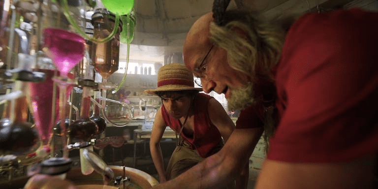 Com isso, a tradução entre animação e live action se constrói nos detalhes. O universo de One Piece em live action é colorido, animado e tosco – no sentido mais positivo da palavra. Além do visual, vale lembrar da identidade que aposta numa maneira mais gráfica de apresentar os personagens, com cartões de visita ou com pôsteres de procurado. Outro ponto que chama atenção é o figurino, que alterna entre as roupas características dos personagens e escolhas alternativas que respeitam o estilo ou a paleta de cores. E se falar de caracterização já não fosse o suficiente para exemplificar o tom nonsense da obra, temos as figuras e os cenários completamente distintos entre si. Ora nos aventuramos numa ilha pré-histórica, ora numa ilha coberta de neve com um médico rena mutante. Cada personagem, cada mutação e cada super poder apresentam aspectos únicos que, para quem não está acostumado ou tem dificuldade de deixar a imaginação agir, pode estranhar. Talvez por isso que One Piece não seja uma obra para todos os gostos – mas para quem gosta, é um prato cheio de diversão!